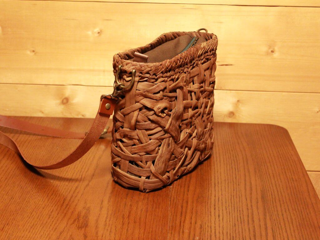 ⑫籠 2目飛8mm幅網代編み、持ち手葡萄の芯、本革ストラップ