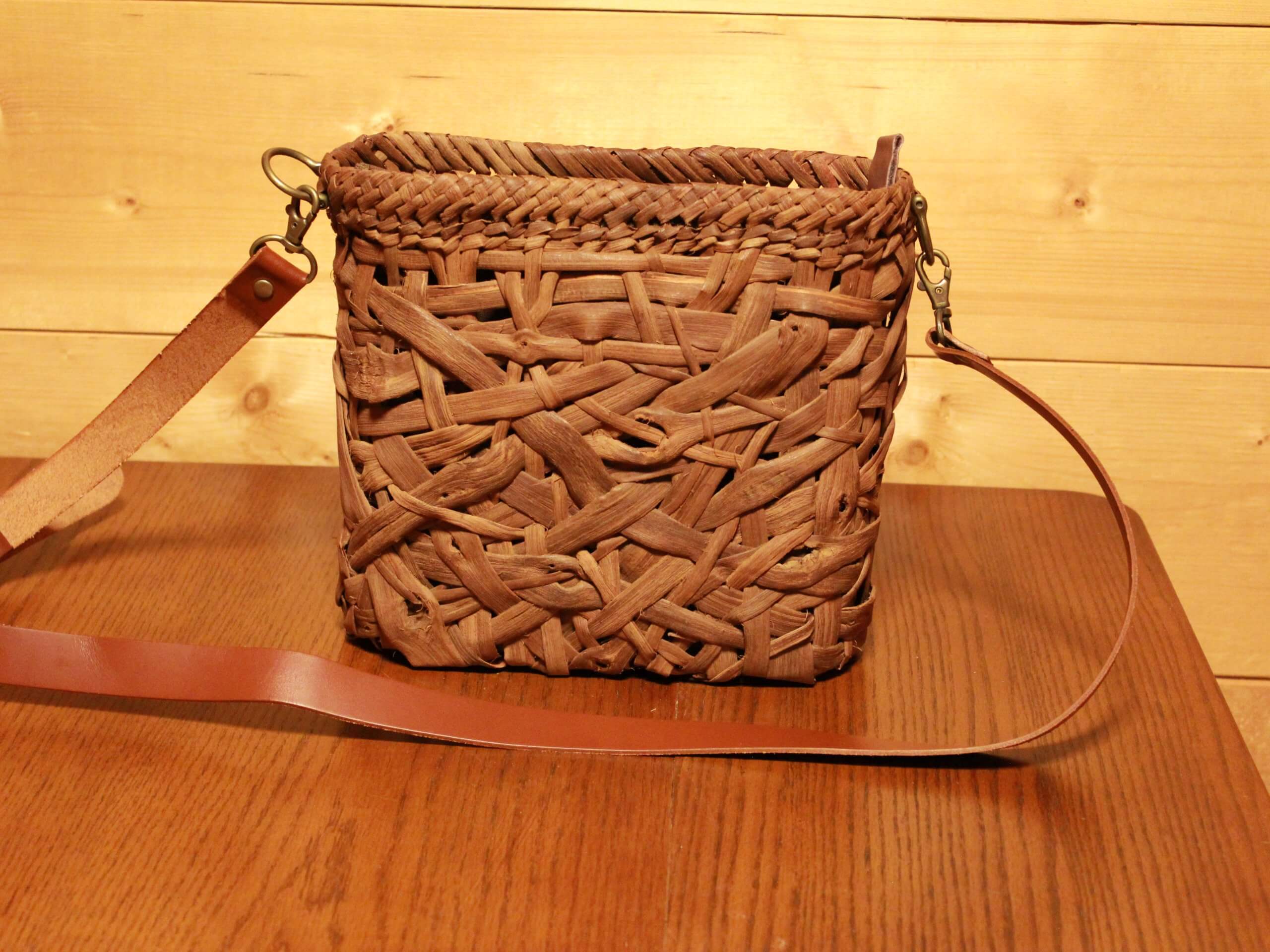 ⑫籠 2目飛8mm幅網代編み、持ち手葡萄の芯、本革ストラップ